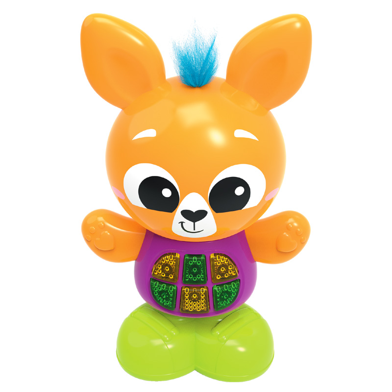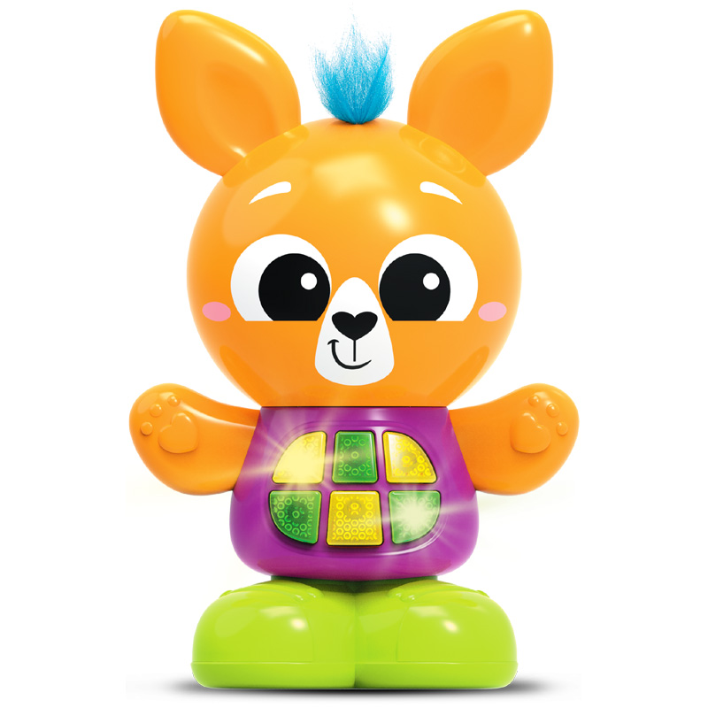 Gotowi na skoczną zabawę z króliczkiem? Skoczek kangurek to uroczy zwierzak, który posiada sprężyste nóżki. Można go przycisnąć i zobaczyć jak podskakuje, jednocześnie słuchając przy tym zabawnych odgłosów sprężynowych skoków! Zabawka mówi w języku polskim i zna aż 25 różnych dźwięków oraz melodii, w tym także edukacyjną piosenkę. Za uruchamianie poszczególnych funkcji odpowiadają świecące przyciski na brzuszku małpki. Żółta czuprynka wyposażona została w sensor dotyku, dzięki czemu, po jej dotknięciu lub pogłaskaniu, usłyszymy zabawne odgłosy. Zabawa ma wpływ na rozwój dziecka poprzez stymulację dotychu, wzroku i słuchu. Zapoznaje z zależnościami przyczynowo-skutkowymi i rozbudza wyobraźnię.