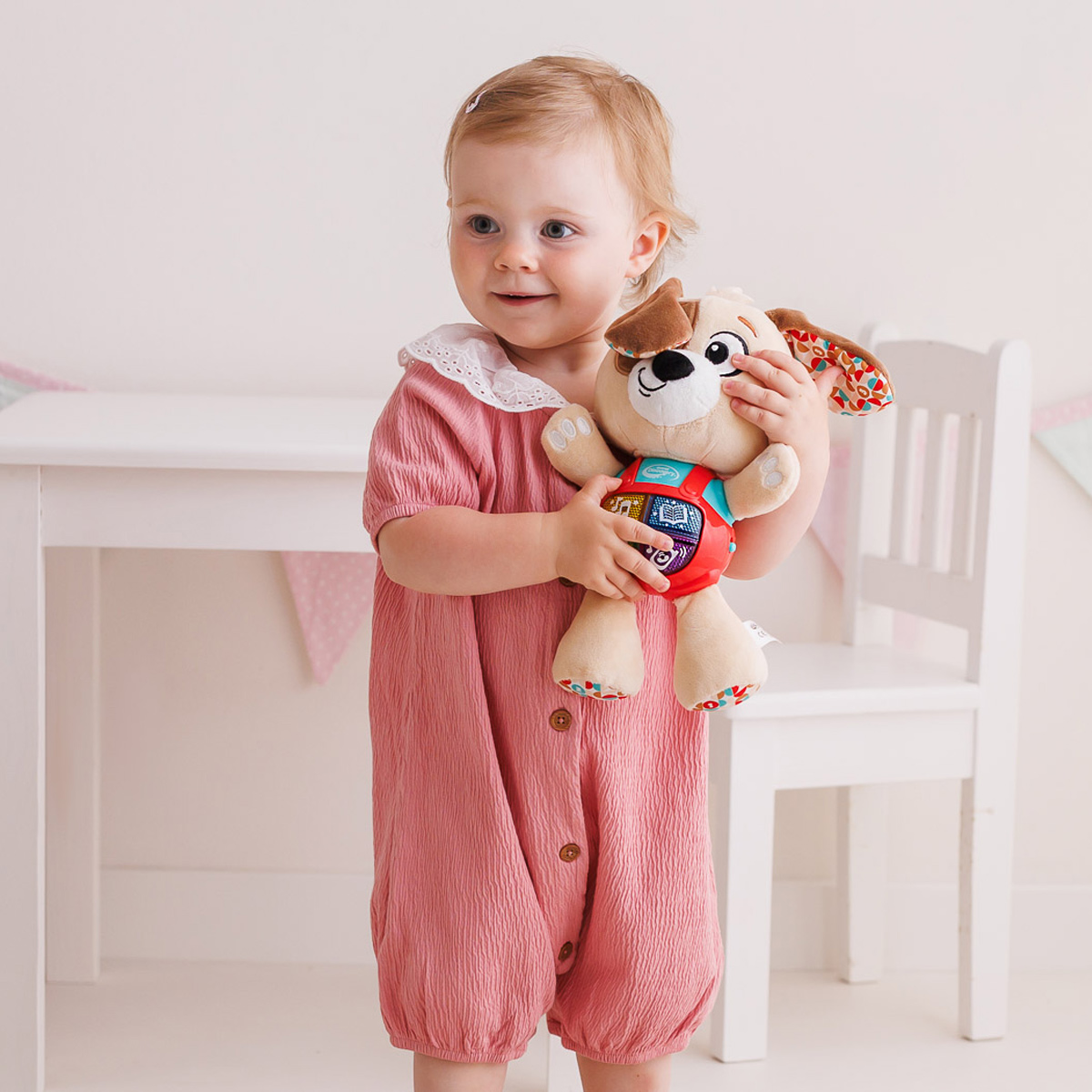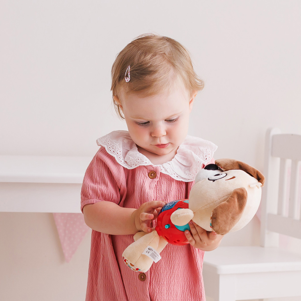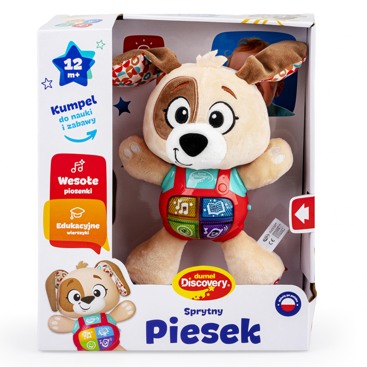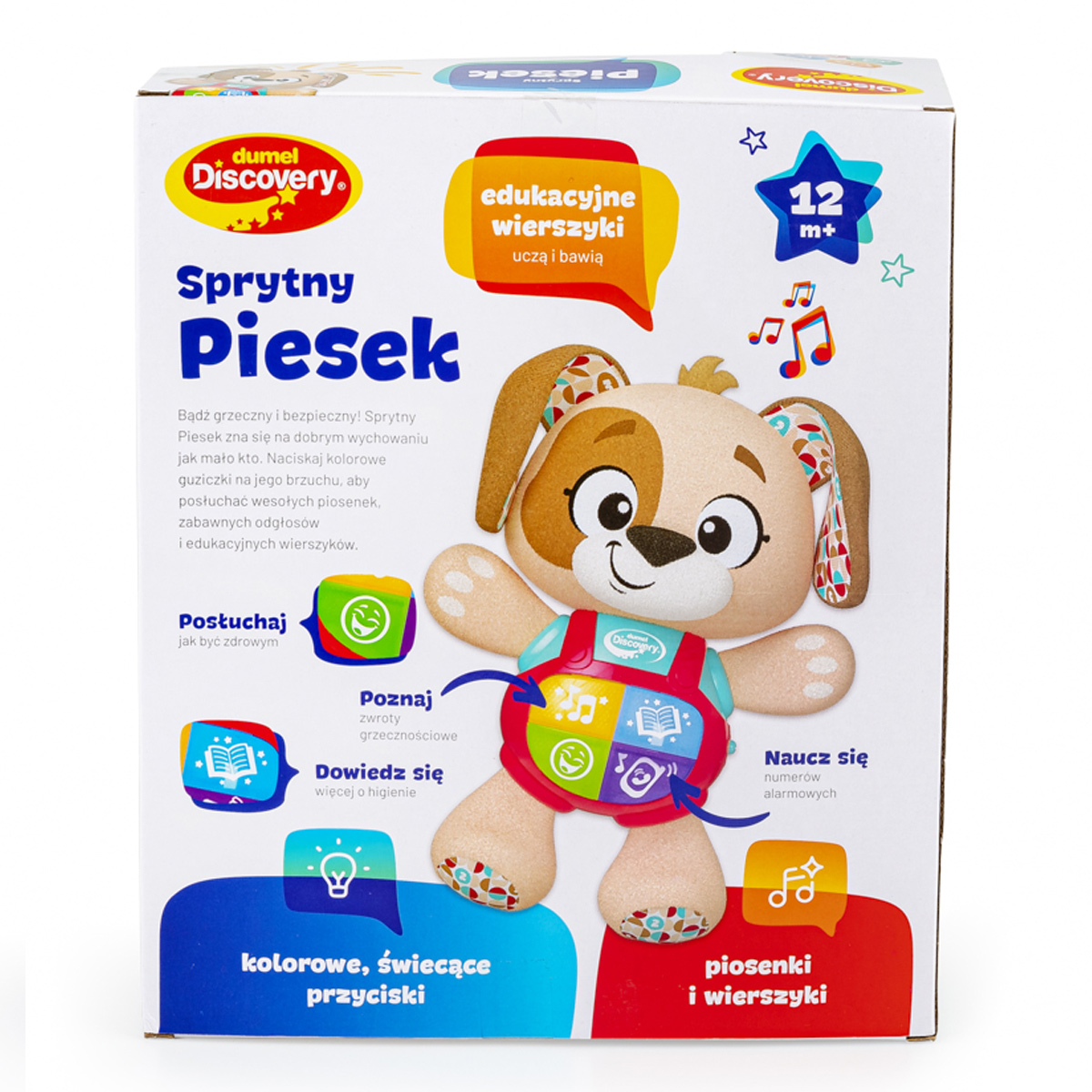 Wesoły bystrzak zapozna najmłodszych z zasadami dobrego wychowania, ucząc o higienie, zdrowym stylu życia, numerach alarmowych i zwrotach grzecznościowych! Na brzuszku tego uroczego pieska znajdują się cztery przyciski, które po naciśnięciu świecą, odtwarzając przeróżne dźwięki. Zabawka łączy naukę z zabawą, gdyż edukacyjne treści i wierszyki, przeplatają się tu z wesołymi piosenkami. Piesio wyposażony został w przełącznik ON/OFF, znajdujący się na boku, który umożliwia bardziej ekonomiczne korzystanie z zabawki, poprzez jej wyłączanie po zakończonej zabawie. Produkt przeznaczony jest dla dzieci od 12 miesiąca życia.