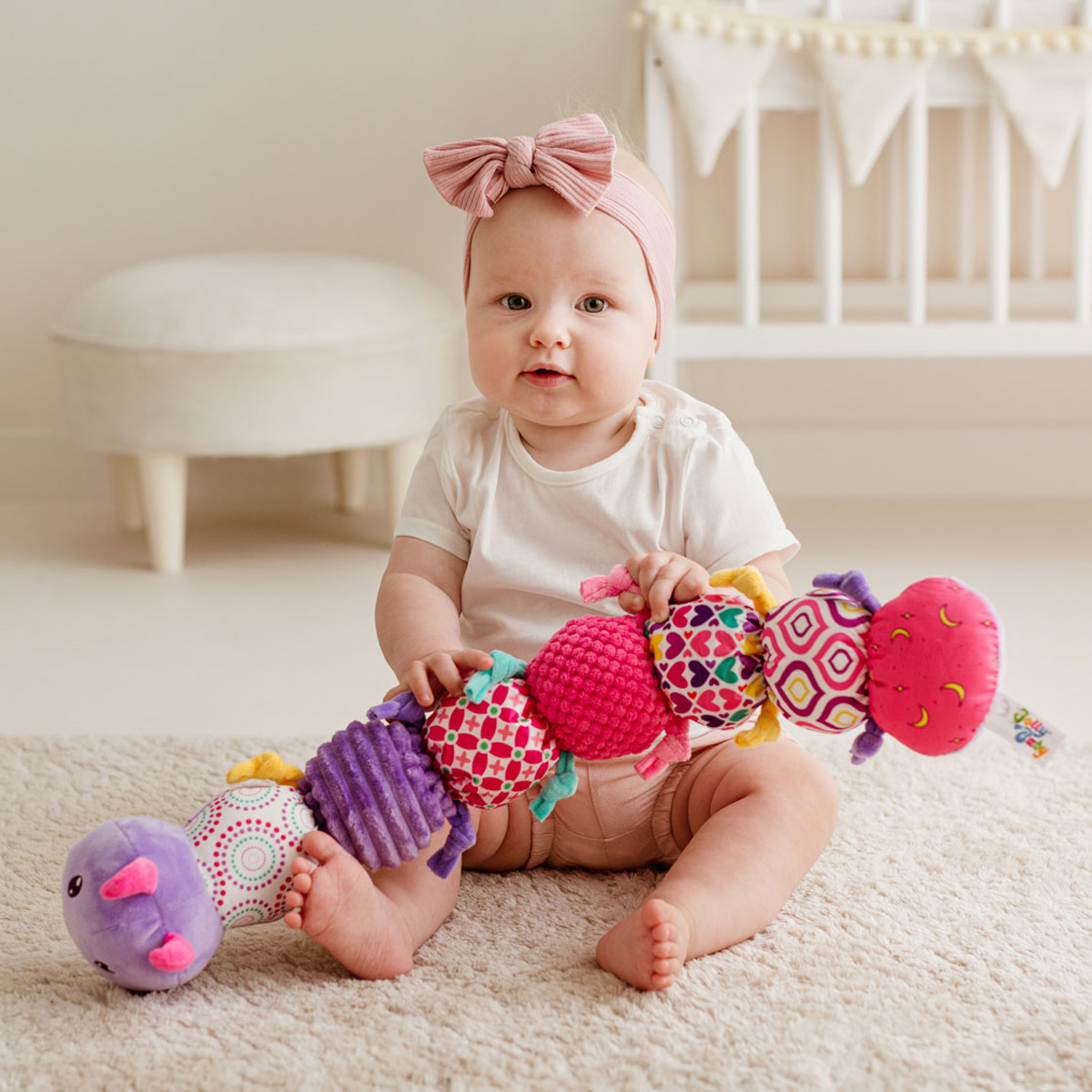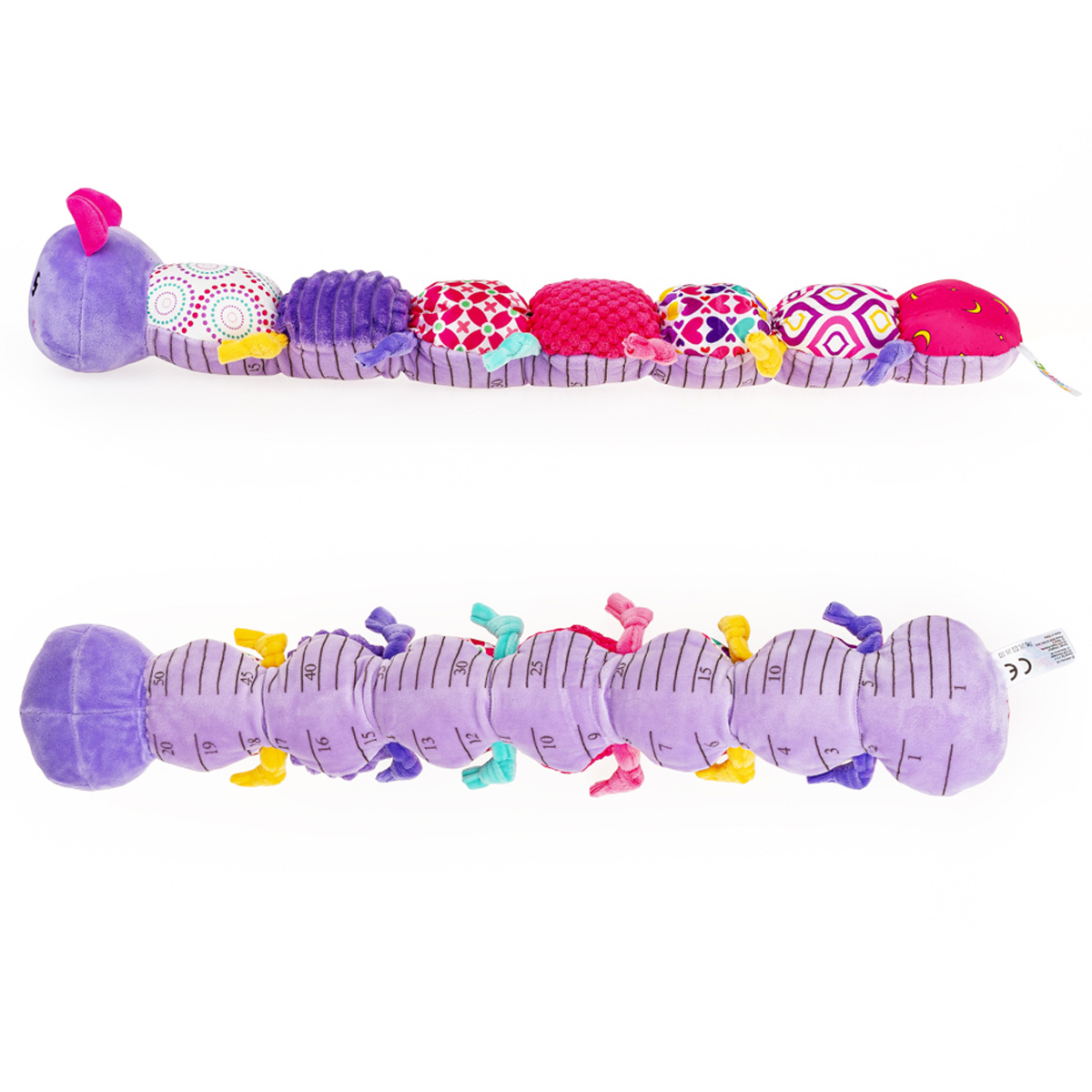 Kolorowa gąsieniczka grzechocze wesoło, zachęcając maluchy do wspólnej zabawy! Poszczególne segmenty jej ciałka uszyte zostały z materiałów o różnych fakturach, w tym takiego, który szeleści, a wszystko po to, aby stymulować zmysły dziecka, wpływając korzystnie na rozwój jego zdolności poznawczych. Zabawka wyposażona została w gryzaczek, kolorowe kółeczka oraz grzechotkę, ukrytą w ostatnim segmencie. Na brzuszku gąsienicy znajduje się miarka w centymetrach i calach, którą można wykorzysać do wesołych zdjęć dziecka z zabawką, a gdy maluch podrośnie – do nauki liczenia. Produkt przeznaczony jest dla dzieci od 10 miesiąca życia.