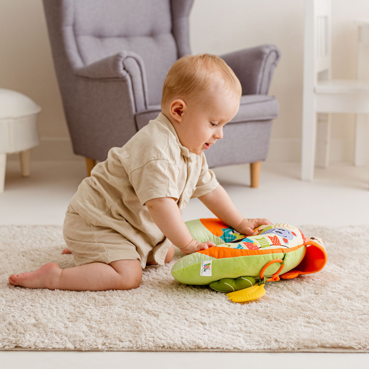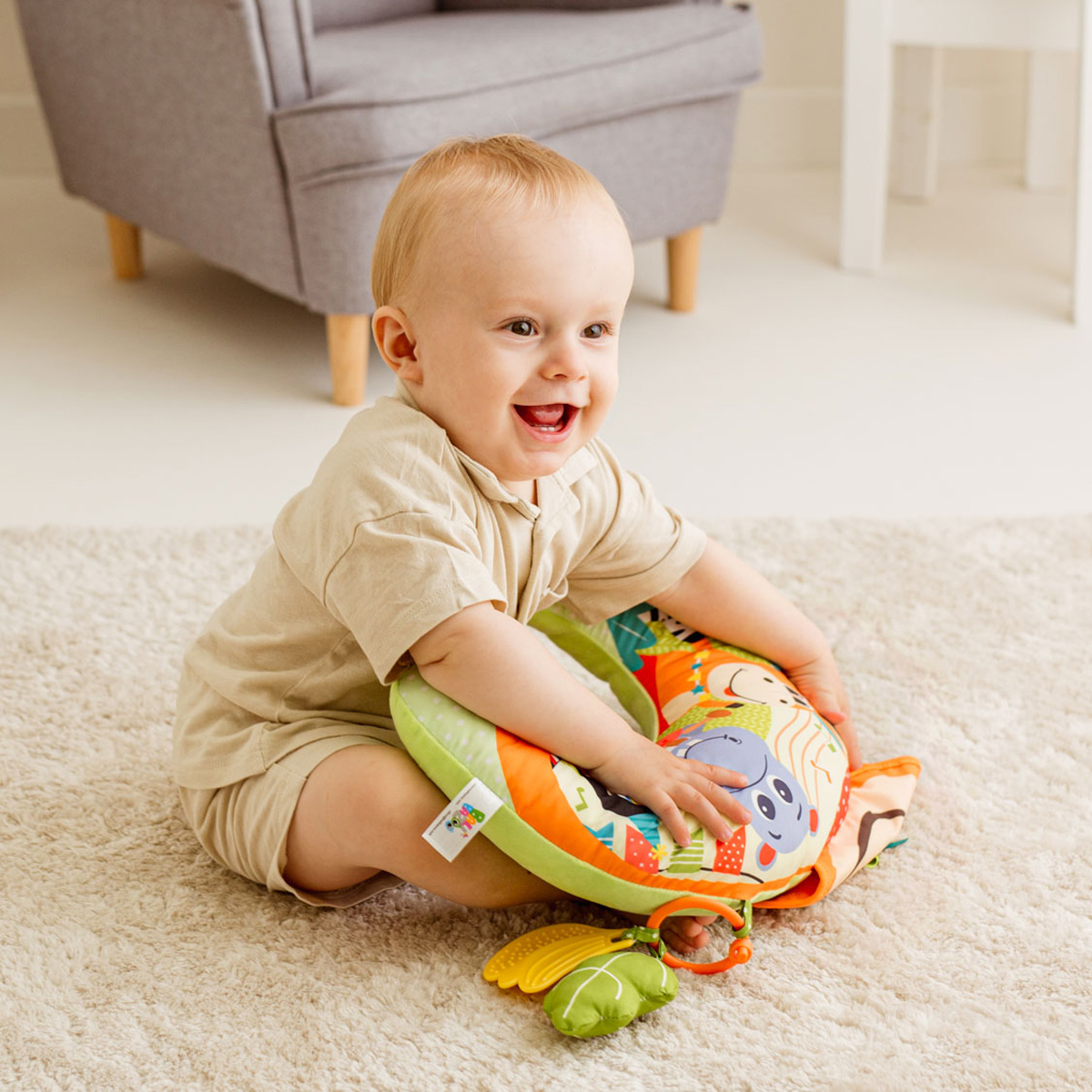 Kolorowa podusia zapewni wsparcie maluszkowi leżącemu na brzuchu i zabawi go wesołymi obrazkami zwierzaczków! Poduszka wykonana została z materiałów różniących się kolorem, nadrukiem, a także fakturą, co pozwoli rozwijać zdolności poznawcze dziecka. Doszyta małpia głowa zabawnie szeleści przy dotykaniu, a przymocowane do poduszki zabawki zapewnią małym rączkom dodatkowe zajęcie. Na jednym z odczepianych kółeczek znajdziemy twarde kształty, a na drugim – piszczałkę w kształcie listka i miękki gryzak w kształcie kiści bananów. Produkt przeznaczony jest dla dzieci od dnia narodzin.